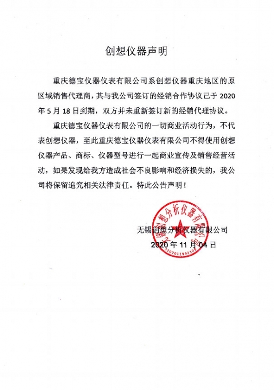 創想儀器聲明與重慶經銷商代理協議已到期