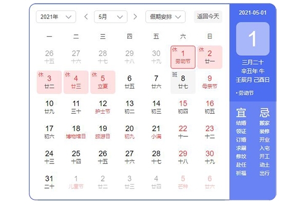 2021年5月1日-5月5日放假調休,共5天。5月8日(星期六)我們正常上班。節前各位同事安排好工作,配合行政做好清潔打掃工作,檢查好電源開關,關好門窗。節日期間,請大家注意人身安全和財產安全,愉快的度過假期。
